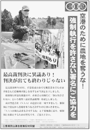 反対同盟は請求異議裁判勝利に向けた「強制執行反対」署名を呼びかけています。次回期日の5月25日に提出する予定で、23日が集約日です。25日は午前9時に千葉市中央公園に集合し、千葉地裁を包囲するデモも予定されています。街頭、職場やキャンパスの仲間に訴え広げましょう。