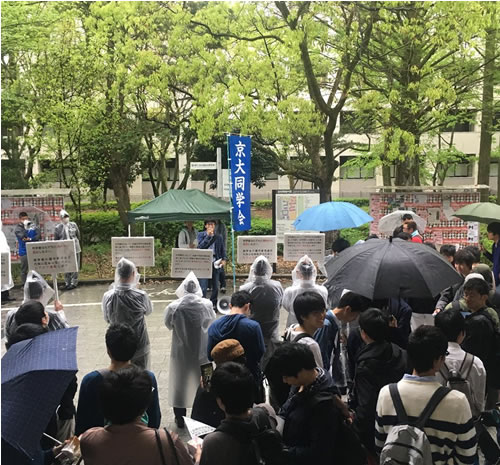 4月26日、京都大学全学自治会同学会と全国の学生は、京大大集会を打ち抜きました。昼休みでのキャンパス集会では、雨が降る中、同学会の仲間が吉田南キャンパス総人広場に登場すると、京大生は大注目、吹き抜けの2、3階の渡り廊下にも鈴なりになって主張に聞き入りました。同学会の「朝鮮戦争絶対反対」「4学生への退学処分阻止」「大学の軍事研究反対」という主張について、討論やアンケートへの協力など、積極的参加がかちとられました。