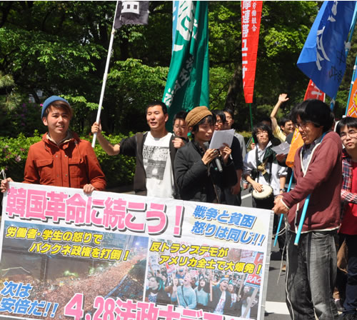4月28日、法政大学文化連盟と全学連は「辺野古新基地建設絶対阻止 改憲・戦争の安倍たおそう!」を掲げて4・28沖縄デー闘争に立ち上がりました。昼の法政大集会―防衛省デモ、文部科学省への申し入れ、夕方の学生労働者集会という一日行動で、朝鮮戦争絶対反対で、日本でも民主労総に続いてゼネストを闘おうと声を上げました。法大当局は前日に文化連盟と全学連を「組織的業務妨害を行っている団体」と言いなして「正門封鎖」を示唆するメールを全学生に送っていました。共謀罪を先取りする大学のありかたを自ら暴露するものです。