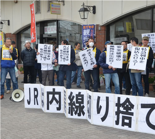 これに対して動労千葉は3月JRダイヤ改定反対、内房線・久留里線の切り捨て反対などを掲げて、すベての本線運転士がストライキに起ち上がりました。動労千葉の闘いは、地域の怒りと結びつき広がりをつくっています。外注化された職場から外注化を撤回させる新たな闘いに挑戦しています。