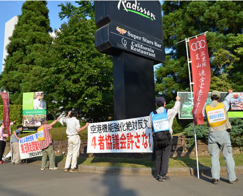 6月12日、反対同盟と支援連は「成田空港に関する4者協議会」が開かれた富里市のラディソンホテル前に登場し、国土交通省、NAA、千葉県、地元9市町の首長たちを弾劾した。