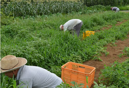午後からは、常連の参加者も合流し、離れで映画『襤褸(らんる)の旗』の上映を行った。「思ったより涼しいから」と伊藤さんと太郎良さんは草取りを継続、現地の仲間も加わった。二人は、午後3時の休憩もとらずに没頭し、それぞれ一列ずつの草取りを貫徹した。
