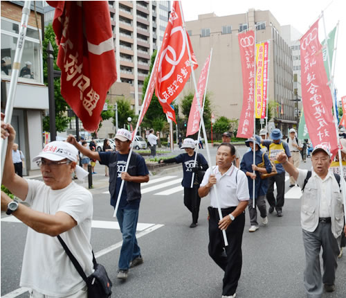 連帯発言を受けた後、婦人行動隊の宮本麻子さんが力強く訴える宣伝カーを先頭に千葉地裁までデモ行進した。