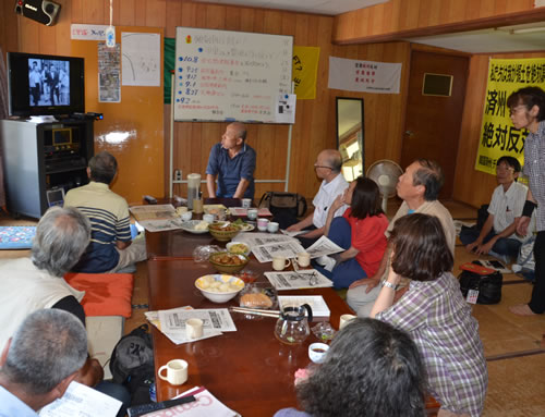 8月27日、第7回の天神峰カフェが成田市天神峰・市東孝雄さん宅離れで行われ、初参加の6人を含め、17人が集う大盛況の集まりとなった。 前日、東海原発反対集会で決戦本部長の太郎良陽一さんから誘われた茨城の男性は、朝の10時に到着し、さっそく太郎良さんの案内で現地調査。