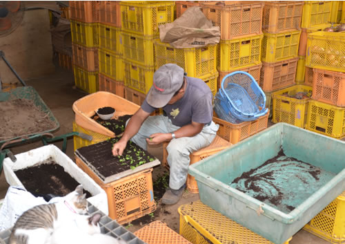 (写真 小猫が見守る中レタスの苗をポットに鉢上げする市東孝雄さん【8月30日 成田市】)