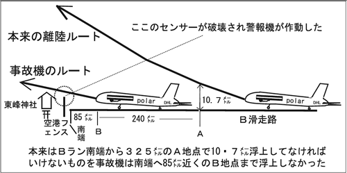 飛行機のB滑走路離陸の場合、滑走路南端325㍍の所で、10・7㍍浮上していなければならない規定になっている。それが、240㍍も東峰部落に迫ったところで、かろうじて離陸したという。まさに間一髪のところで、大事故を免れたということだ(図参照)。しかも離陸機だから燃料満載だ。