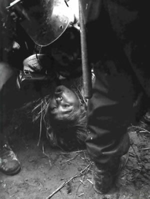 (写真 襲いかかる機動隊をにらみつける大木よねさん【71年9月 成田市】)