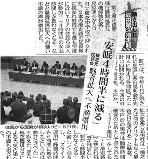 横芝光町では10月29日から説明会が始まった。12月2日までの予定で行われる。10月29日には、「空港騒音 断固反対」の看板が建てられた中台部落で説明会が行われた。「6時から23時の飛行時間を厳守しろ」などの激しい反対の声が上がった。