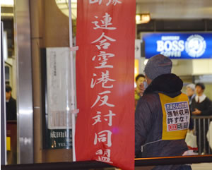 ●支援連は、京成成田駅頭街宣を行った。他の空港が夜間の飛行制限を8〜10時間行っているのに、成田だけなぜ4時間しかないのかを訴える「成田だけ4時間?」と題したビラをまきマイクでアピールした。(15日=写真)
