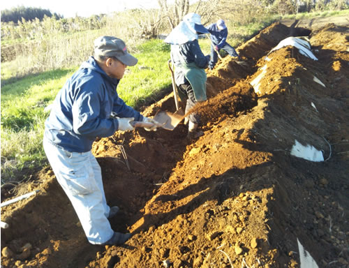 (写真 里芋の貯蔵のために土をかける市東さん )