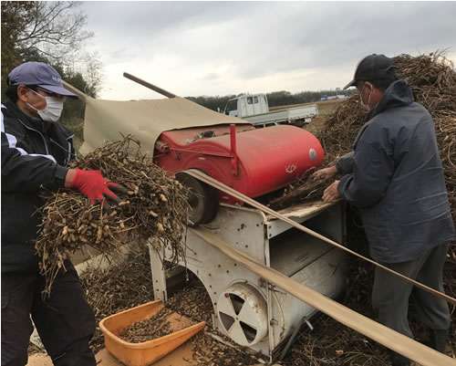 11月27日、のう積みし乾燥させていた落花生の脱穀を行いました。萩原さんが作っている品種はコクがあり甘みが強く、香りも高い知る人ぞ知る千葉半立ち。全国的にはあまり出回っていません。