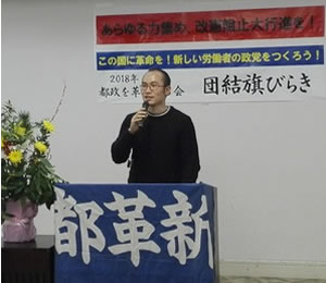 冒頭に代表の長谷川英憲さんが60年代以来の都革新の闘いを語り、改憲阻止の重大な決意を表明。続いて事務局長・東京西部ユニオン副委員長の北島邦彦さんが発言し、「戦争と改憲、『働き方改革』が大焦点となる今年は地域に改憲阻止の拠点をつくる。都革新はその先頭に立つ」と語った。斎藤郁真全学連委員長は「戦争反対と生活を守る闘いを一つにしていく。大学が金もうけに手を染め、一方で学生の団結を破壊し自治会をなくしていく攻撃がある。18年、世の中をひっくり返す闘いを!」とアピールした。