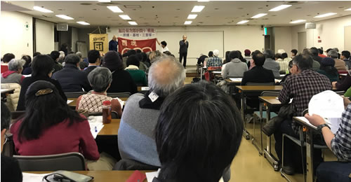 2月3日、東京都府中市で「福島菊次郎が問う『戦後』写真展―原爆・基地・三里塚」が開催されました。武蔵大学教授の永田浩三さんが「福島菊次郎その業績を考える」と題した講演を行い、砂川平和ひろば主宰の福島京子さん、反対同盟の太郎良陽一さんが闘争現場からの報告を行いました(写真)。会場には写真集などの書籍や三里塚野菜の販売コーナー、砂川闘争や三里塚闘争を紹介するパネルの展示コーナーなどが設けられ、来場者が会場を埋め尽くす中で講演企画が始まりました。
