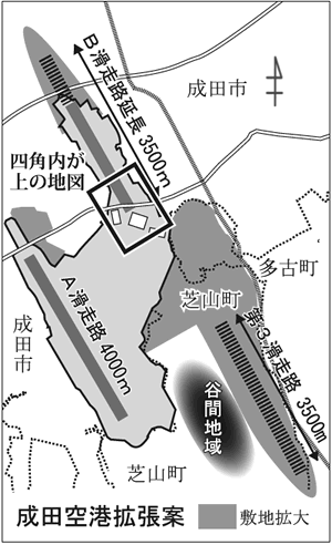 現在の攻防の焦点であるB滑走路南側の地図(左)をご覧下さい。滑走路の南側には東峰部落が存在し、人家や畑、神社、墓地が南側への延伸を阻んでいます。また、滑走路の東側には開拓組合道路があり、西側には反対同盟員で専業農家の市東孝雄さんの家と畑が存在しているため誘導路は「へ」の字に曲がっています。現在の三里塚闘争の最大の焦点は、この「へ」の字誘導路の直線化をめぐる市東さんの農地取り上げとの攻防です。
