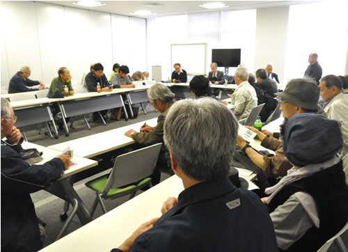 千葉県弁護士会館で報告集会が開かれ(写真)、弁護団全員が裁判所の姿勢を根本的に弾劾し、勝利への決意を述べた。午後から反対同盟と支援連は、千葉市街地で「強制執行反対」署名を呼びかけた。