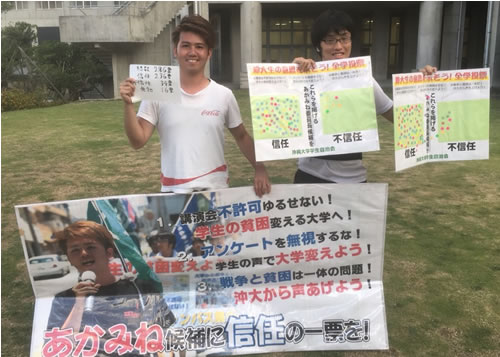 「一人二人の強い活動家の運動から、全体を獲得する闘いへと広げていきたい」----これは、5月13日に沖縄県青年会館で行われた全国学生集会での赤嶺君の言葉です。沖大学生自治会は、この信念を貫いて1年間闘ってきました。高い学費を払うためにバイト漬けの沖大生の現状に、「基地の島」「非正規職の島」沖縄で学生が声を上げるには、学生の貧困をなくしていかなければならないと訴えた昨年の自治会執行部選挙。ついに沖大生の声を大学当局に受け取らせた全学アンケート運動。教員や記者の決起も引き出し、学内開催にあと一歩まで迫った今年の新歓企画「こどもの貧困」講演会。