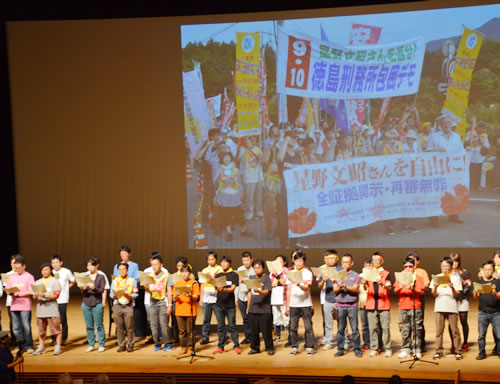 共同代表の戸村裕実さんは、星野投獄は国家犯罪と指摘し、①取り調べでのでっちあげ、②懲役20年判決を覆した無期判決、③証拠開示に応じず再審を閉ざす、④徳島刑務所による不当な懲罰、友人面会の禁止、の4点を挙げて断罪した。そして、四国地方更生保護委員会が更なる罪を犯さないよう要望書を突きつけようと呼びかけた。