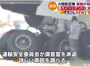 6月29日午後0時35分ごろ、成田空港B滑走路に着陸した韓国・仁川空港発の大韓航空703便ボーイング777が、誘導路を走行中に右主脚の車軸が折れて動けなくなった。乗客乗員335人にけがはなく、着陸後1時間40分後からバスでターミナルに運ばれたが、機体の移動は翌30日未明までかかり、この間誘導路は閉鎖された。国交省はこの事故を即日「重大インシデント」に認定、運輸安全委員会が原因を調べている。(写真)