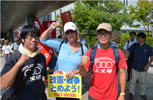 (写真 8・6ヒロシマ大行動のデモ前に米「反戦の母」シンディー・シーハンさんと記念撮影【6日】)