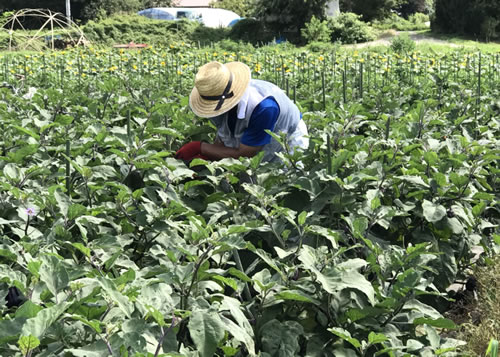 (写真 炎天下でナスの収穫に励む萩原富夫さん)