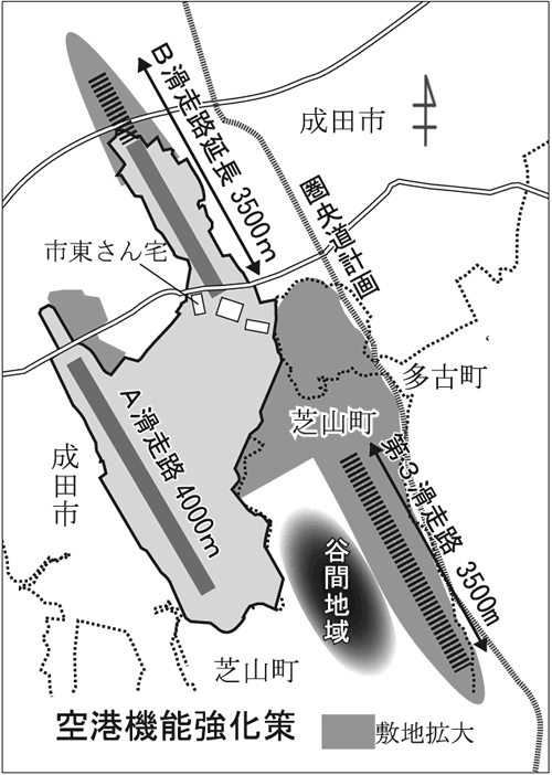成田では、①約1240戸を移転させ1千㌶もの敷地を拡大する第3滑走路建設、②当面、先行的にA滑走路の1時間延長(朝6時〜夜12時半まで)と夜10時台の便数制限の撤廃、第3滑走路供用後は、空港全体で朝5時〜夜12時半まで飛行時間を延長、③B滑走路の北側への1千㍍延伸を画策している。