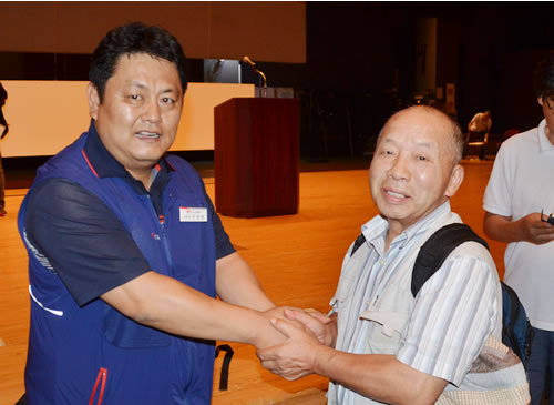 集会後、反対同盟の伊藤信晴さんと民主労総のクジャヒョンさんが握手を交わした。(写真)