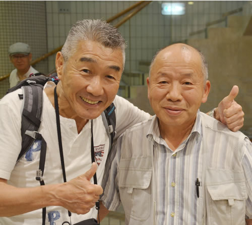 ●東京都曳舟文化センターで「アベを倒して改憲とめよう!8・12集会」が行われ、反対同盟の伊藤信晴さん、三里塚現闘、全学連行動隊が参加した。(12日=写真は松元ヒロさん〈左〉と伊藤信晴さん)