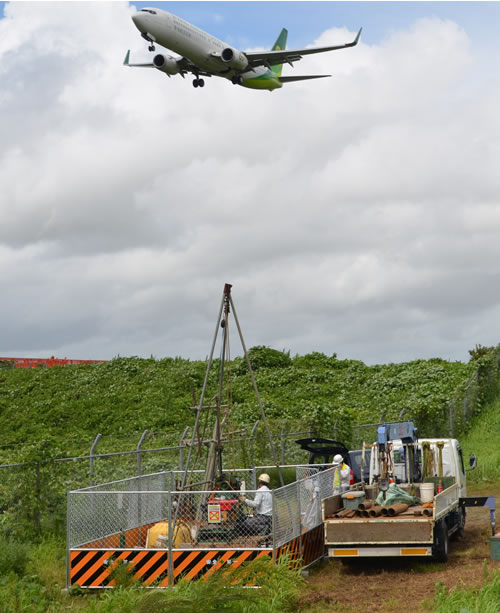(写真 B滑走路の北側飛行直下で進められている地盤調査と設置された看板)