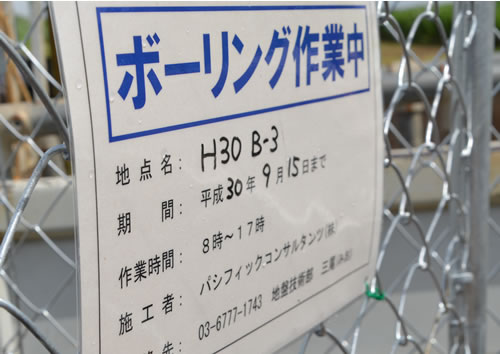 3日午前、本紙記者が現場を訪れるとフェンス内で2人がボーリング作業を行っていた。施工者であるパシフィックコンサルタンツ(株)のヘルメットをかぶる職員が一人やってきて「取材は受けていない。人物が特定されるような写真はダメ」と対応してきた。