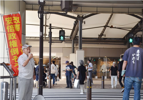 報告集会後、反対同盟と支援連はJR千葉駅前で10・14大結集に向けた大情宣活動を行い、「改憲阻止・安倍打倒」「空港反対・農地死守」を熱烈に訴えた(写真)。