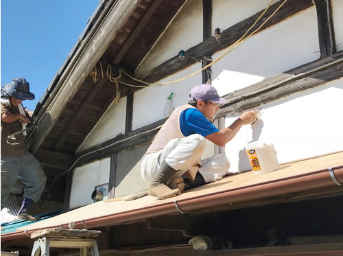 (写真 台風で崩れた壁を漆喰【しっくい】で補修する萩原富夫さん【10月1日】)