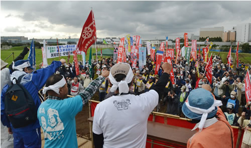 10月14日、三里塚芝山連合空港反対同盟の主催で全国総決起集会が開かれ、全国の労働者・農民・学生・市民680人が結集し大成功した。反対同盟・決戦本部と支援連絡会議は全国集会に先立ち、空港周辺の住宅5千軒へのポスティング、成田周辺の駅頭での早朝情宣活動、さらに津田沼駅にも足をのばし、宣伝戦を全力で闘い新たな地平を切り開いている。残り2カ月、全国で要望書を集め、11・19千葉地裁包囲行動へ! 12・20勝利判決をかちとろう!