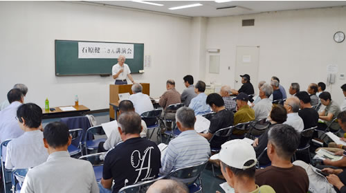 10月7日、「いま、こめが危ない! これでいいのか! 安倍農政」と題する石原健二さん(農業経済学者)の講演会が横芝光町文化会館で開かれた。全国農民会議共同代表の小川浩さんが司会をつとめ、地元の農民、反対同盟ほか50人が参加した(写真)。