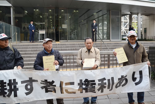 (写真 〝耕す者に権利あり〟要望書提出にのぞむ反対同盟)