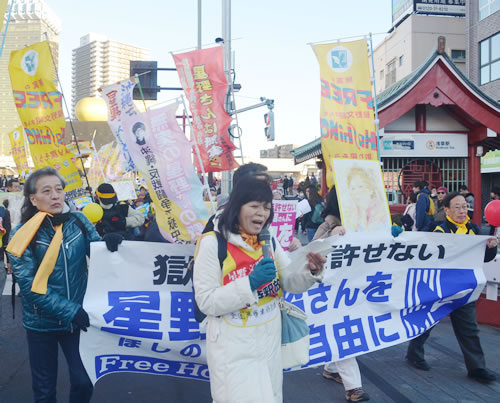 浅草パレードは黄色いのぼりをなびかせてのデモ(写真)。沿道から大きな注目を浴び、「今が星野さん解放の時だ」との思いを強くした。