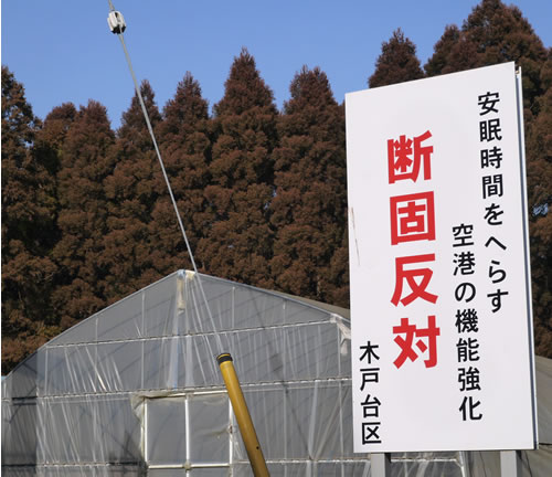 第3滑走路の建設予定地や騒音直下の部落も回りました。荒れ地や山林が広がっている当初のイメージとは異なり住宅や農家が集中し、住民手作りの看板(写真)が数多くみられ、住民の怒りの深さを知りました。