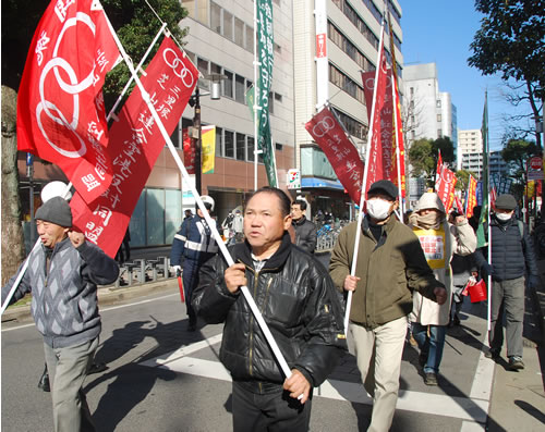 関西実行委、市東さんの農地取り上げに反対する会の連帯発言を受け、デモに出発した。宣伝カーからは婦人行動隊・宮本麻子さんが「農地死守」の訴えを千葉市繁華街に響かせ、デモは地裁に力強く迫った。