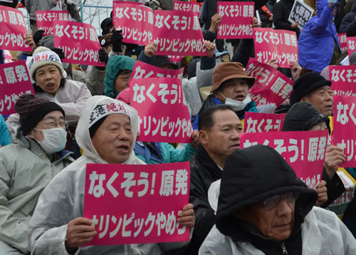 (写真 「なくそう原発!オリンピックやめろ」のボードを一斉に掲げコールする参加者【3月11日】)