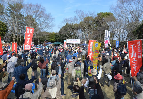 「市東さんの農地取り上げに反対する会」と、各地の「市東さんの農地を守る会」が壇上に並び発言した。群馬・守る会の大塚正之さんは、群馬合同労組にコンビニのオーナーが加盟した勝利を報告した。