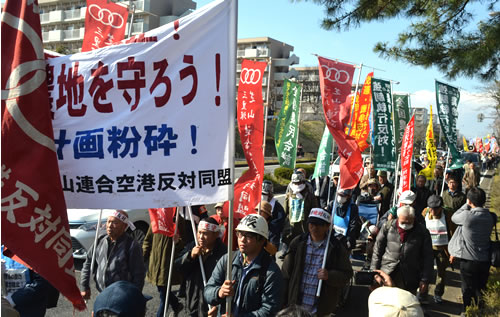 3月31日、三里塚芝山連合空港反対同盟の主催する全国総決起集会が成田市赤坂公園で開かれ、全国から460人が集まった。空港関連企業で働く労働者家族が多く住む成田ニュータウンの大通りを意気高く進むデモ隊の迫力は街の雰囲気を塗り替え、多くの市民・家族連れが注目した。全参加者は「農地死守」の決意を固め、自らの現場に闘いの熱気を持ち帰った。