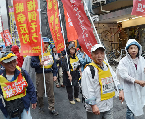 「非正規だけの社会をつくらせない」として自治体労働者、東京西部ユニオン鈴木コンクリート工業分会が発言し、動労水戸の石井真一委員長、セブン―イレブン・ジャパンと闘う千曲ユニオンの河野正史副委員長、外登法・入管法と民族差別を撃つ全国実行委員会の仲間が闘いの決意を語った。集会後、雨を突き銀座デモに打って出た。「非正規をなくせ、天皇制を廃止しよう」のコールに沿道から多くの注目と共感が寄せられた。