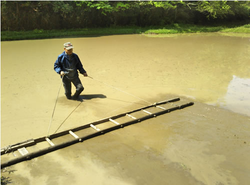 (写真 はしごにつけたロープを引き、田んぼの表面を平らにする市東孝雄さん【5月2日】)