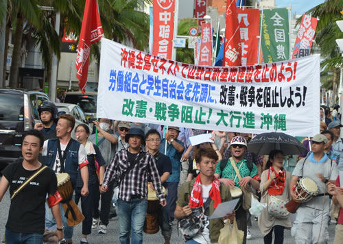 (写真 右翼の妨害を蹴散らし国際通りを元気よくデモ行進【5月18日 那覇市】)