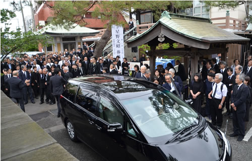 国内外から寄せられた総計69の弔電と弔文の一部が紹介された。音楽家の丸尾めぐみさんが「ソリダリティ」等をピアノで演奏する中、参列者が次々に献花して最後の別れを告げた。革共同の真紅の旗とFree Hoshinoの黄色ののぼりで包まれたひつぎが車に乗せられ、暁子さんが助手席に座って斎場に出発。光明院を埋めた参列者はインターナショナルの斉唱で見送った。