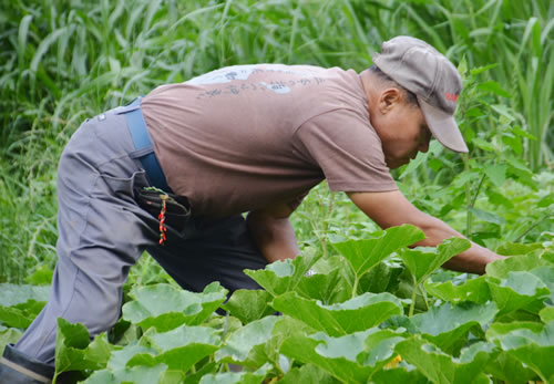 (写真 天神峰農地で漬けうりの成長を確認しつつ草を取る市東孝雄さん【6月21日】)