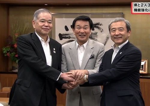 (写真 左から夏目誠NAA相談役、森田健作千葉県知事、田村明比古NAA新社長)