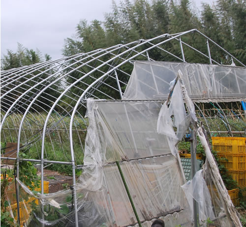 萩原富夫さん宅は台所の屋根が破損した。ビニールハウスがパイプごと激しく変形して、一部が風に飛ばされて県道の電柱にぶら下がった。市東孝雄さん宅も2棟のハウスがボロボロになり、中にあったレタスなどの苗がダメになった。
