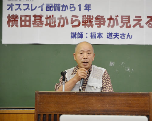9月8日、東京・昭島市での「オスプレイ配備から1年 横田基地から戦争が見える」と題する改憲・戦争阻止!大行進三多摩実行委員会などの主催の改憲阻止学習会に反対同盟の伊藤信晴さんと参加した。伊藤さんは、9・24請求異議裁判闘争と10・13全国集会の結集を強く訴えた。(写真)