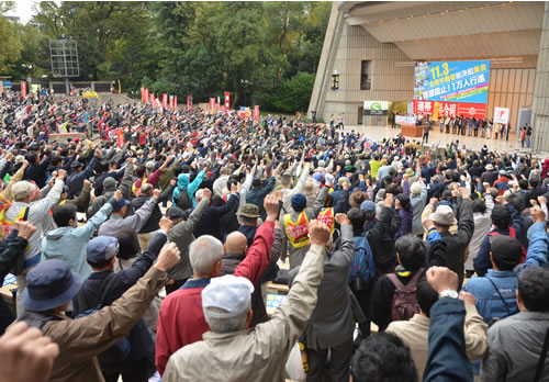 集会は、全日建運輸連帯労組関西地区生コン支部への大弾圧を弾劾し、JR乗務員制度大改悪を始めとした「労働組合のない社会」をつくる攻撃に立ち向かって、闘う労働運動をよみがえらせることを誓った。これをテコに、大行進運動を全国津々浦々から組織し、改憲阻止の大決戦に立ち上がることを訴えた。海外から韓国・民主労総、台湾、ドイツなどの労働者が結集して力強くあいさつし、国際連帯の前進が勝ち取られた。