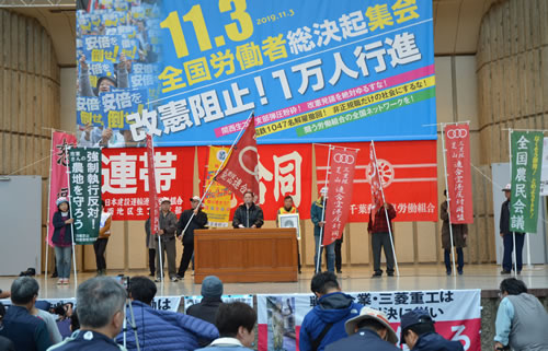 東京・日比谷野外音楽堂で開かれた11・3全国労働者総決起集会と改憲阻止!1万人行進に3900人が結集し、「関生弾圧粉砕、改憲発議阻止、安倍政権打倒」を叫ぶ銀座デモが打ち抜かれた。三里塚芝山連合空港反対同盟からは、市東孝雄さん、萩原富夫さん、伊藤信晴さん、太郎良陽一さん、木内敦子さん、宮本麻子さんが駆けつけ全国・海外からの仲間と共に闘った。改憲と戦争に突き進む安倍政権との闘いはいよいよ本番だ。改憲阻止決戦の勝利に向け、意気高く闘う反対同盟と団結しよう。12・14三里塚現地闘争&団結いも煮会に集まろう!